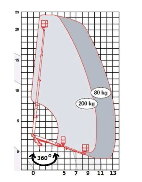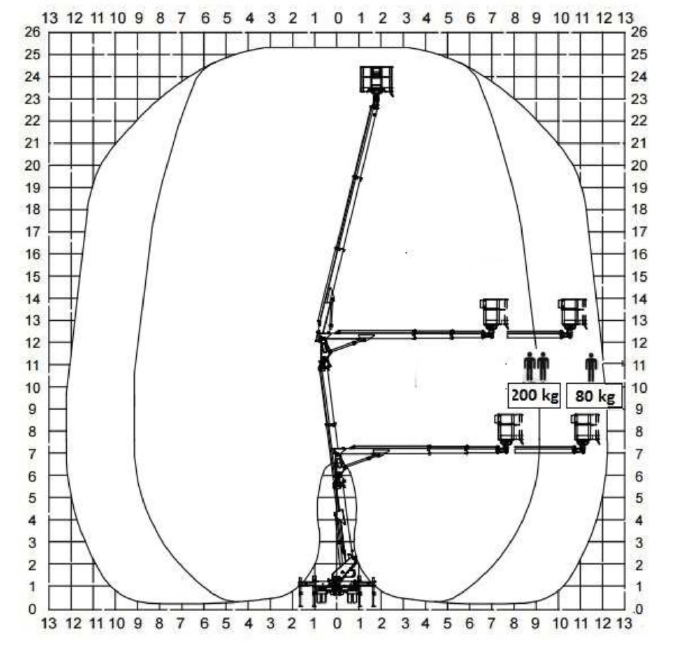 194. W oparciu o przedstawiony wykres pola pracy wskaż maksymalny wysięg platformy roboczej obciążonej masą 200 kg uniesionej na wysokość 22 m: