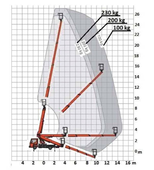 195. W oparciu o przedstawiony wykres pola pracy wskaż maksymalny wysięg platformy roboczej obciążonej masą 230 kg uniesionej na wysokość 17 m:
