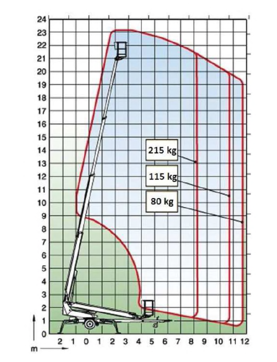 205. W oparciu o przedstawiony wykres pola pracy wskaż maksymalny wysięg platformy roboczej obciążonej masą 215 kg uniesionej na wysokość 22 m: