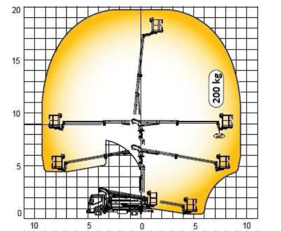 227. W oparciu o przedstawiony wykres pola pracy określ maksymalną dopuszczalną ilość osób jaką można podnieść na wysokość 18 m przy wysięgu 10 m