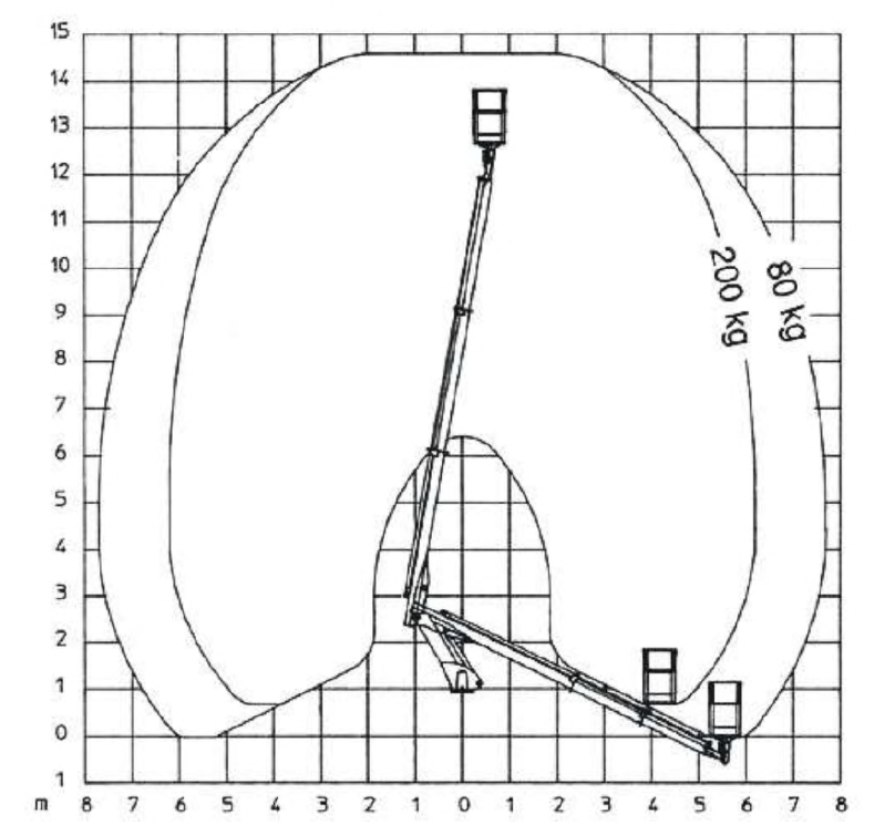 218. W oparciu o przedstawiony wykres pola pracy wskaż maksymalny wysięg platformy roboczej obciążonej masą 80 kg: