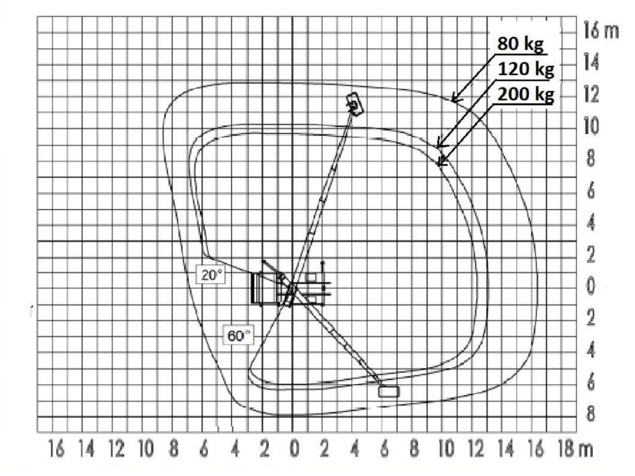 208. W oparciu o przedstawiony wykres pola pracy wskaż maksymalny wysięg platformy roboczej obciążonej masą 80 kg uniesionej na wysokość 18 m:
