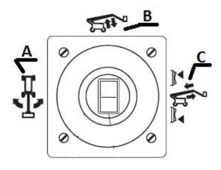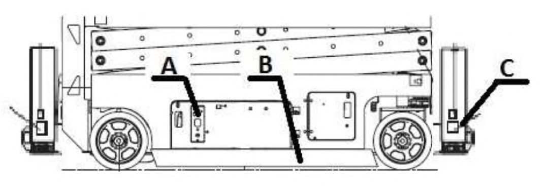 87. Załączenie mechanizmu podnoszenia podestu nożycowego realizowane jest poprzez wychylenie dźwigni sterującej po wcześniejszym wciśnięciu przycisku oznaczonego literą: